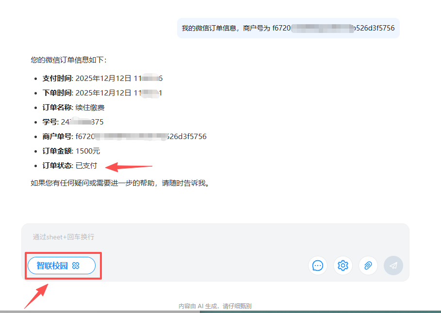 进入APP中的“沈工小智功能”,选择“智联校园”,查询微信中的商户号或交易单号,即可知道订单结果